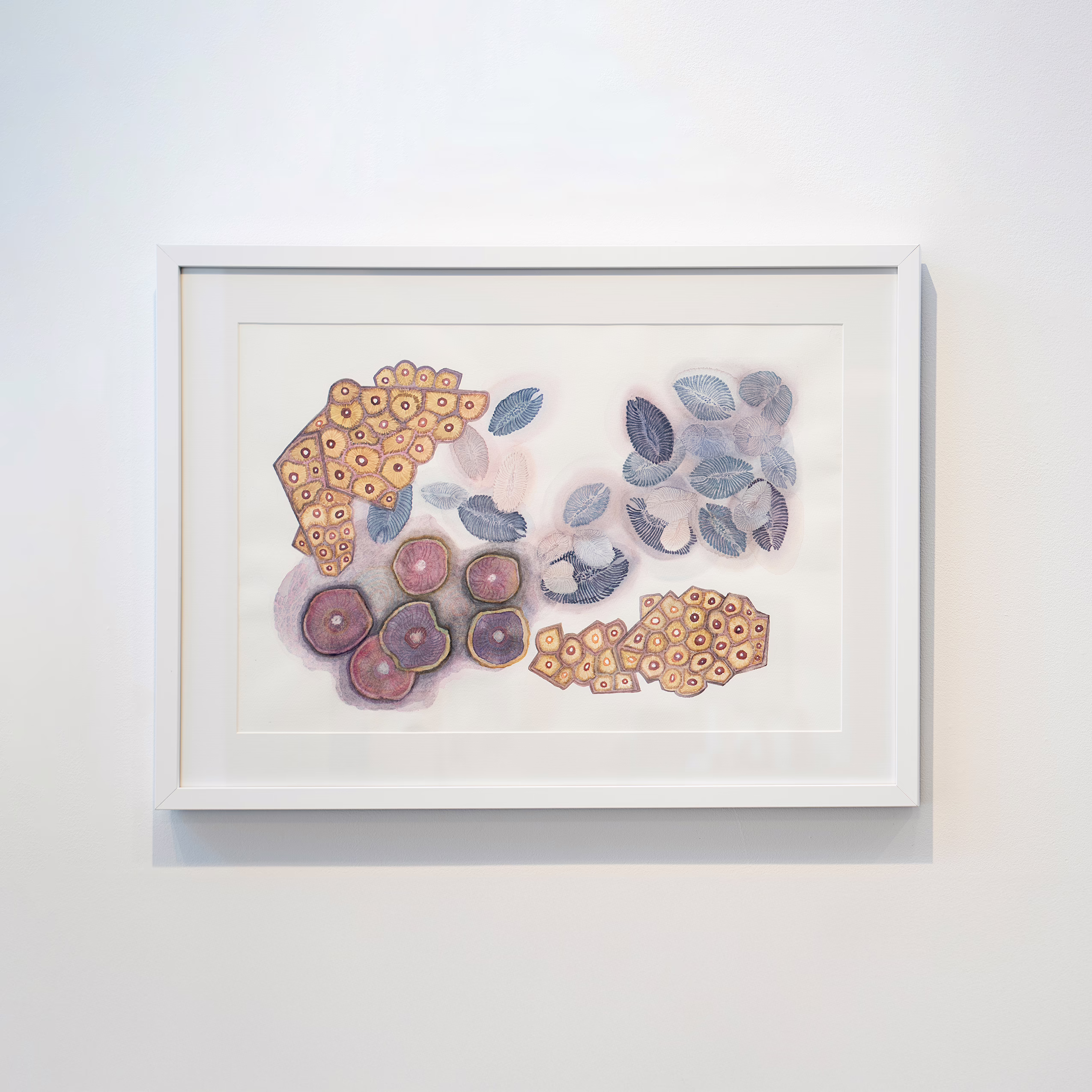 My series Ars longa is about ancient life forms. Focusing on the first part of the phrase Ars longa, vita brevis, the “artists” in my series are those who lived long before us, throughout the millions of years of Earth’s evolution. Fossils of the lozenge-shaped Dickinsonia have been chemically analyzed, revealing them to be the first non-microscopic animals to live on Earth. In 2018, an unusually well-preserved fossil was found to contain cholesterol, a fat present only in animals’ bodies. A vast diversity of animal life has sprung from those first individuals.