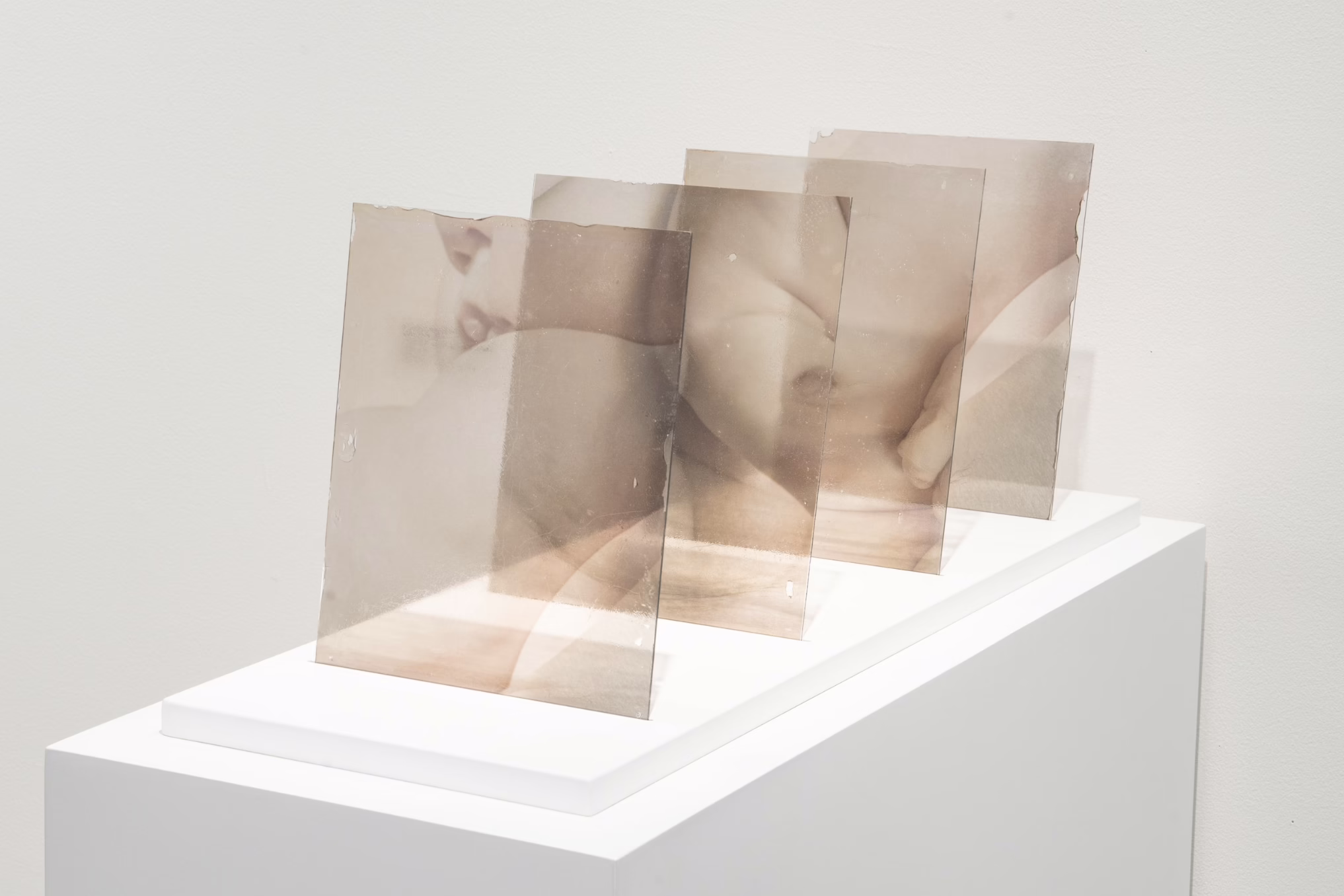 Matrescence explores the process of becoming a mother and the often invisible labor of caretaking. Through photography and gel image transfer techniques on glass, the work captures the multifaceted nature of the maternal experience. Images of my son and myself merge and separate depending on the viewer’s angle, symbolizing the nuanced and often obscured aspects of maternal life. The transparent and reflective glass panels serve as metaphors for the visibility—or lack thereof—of maternal labor.