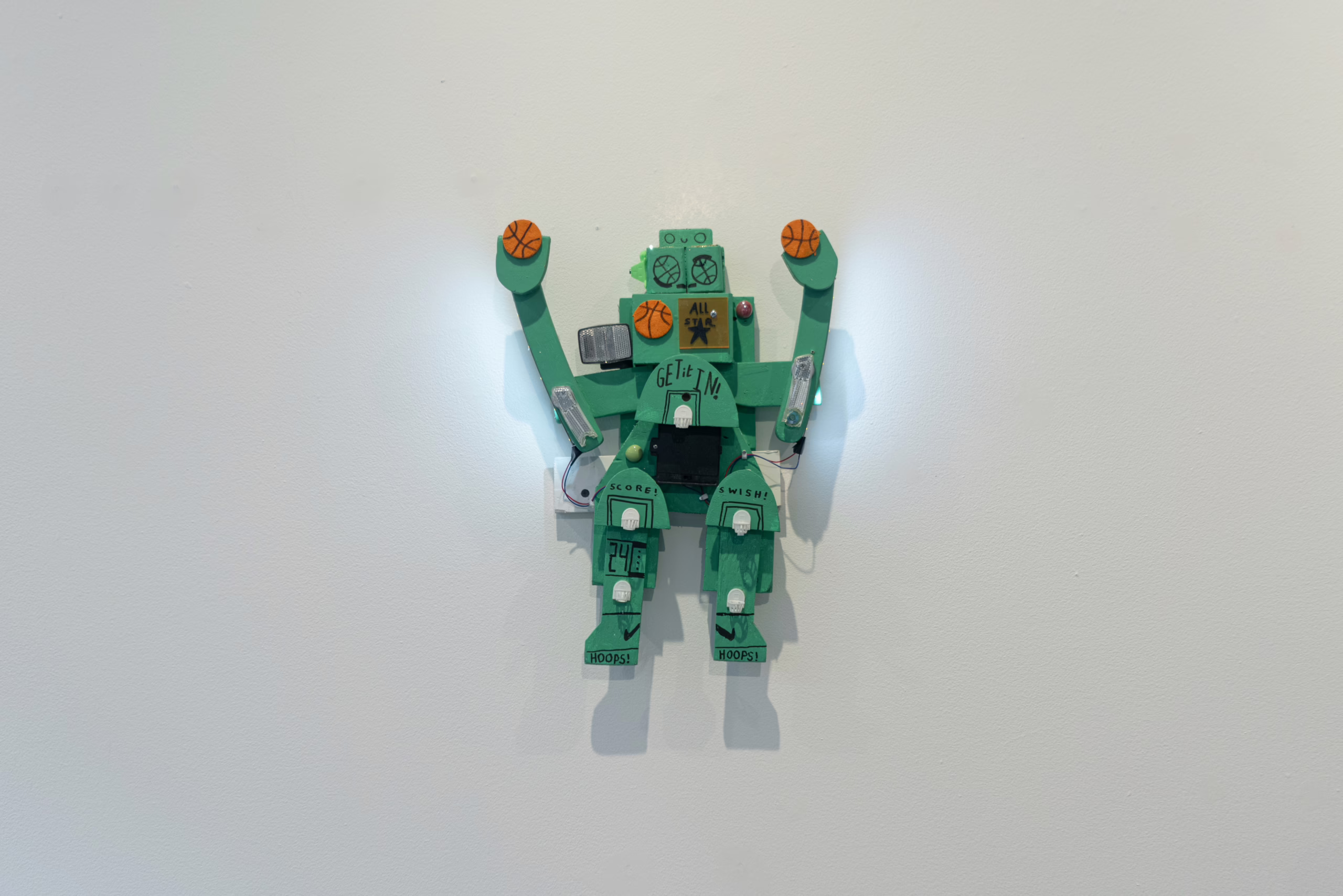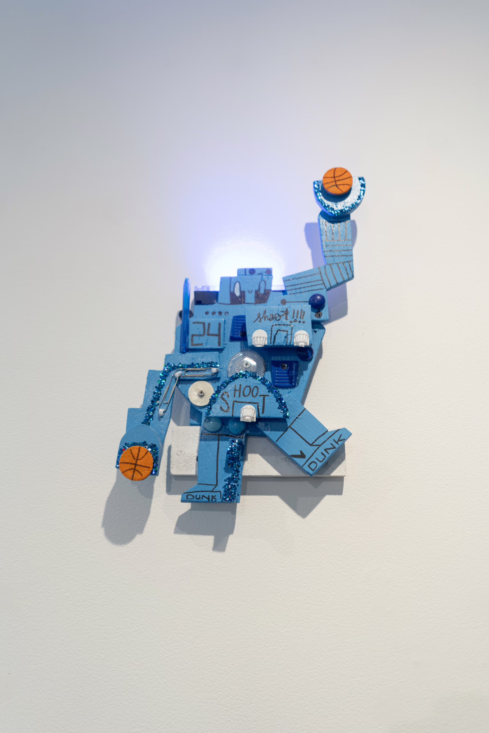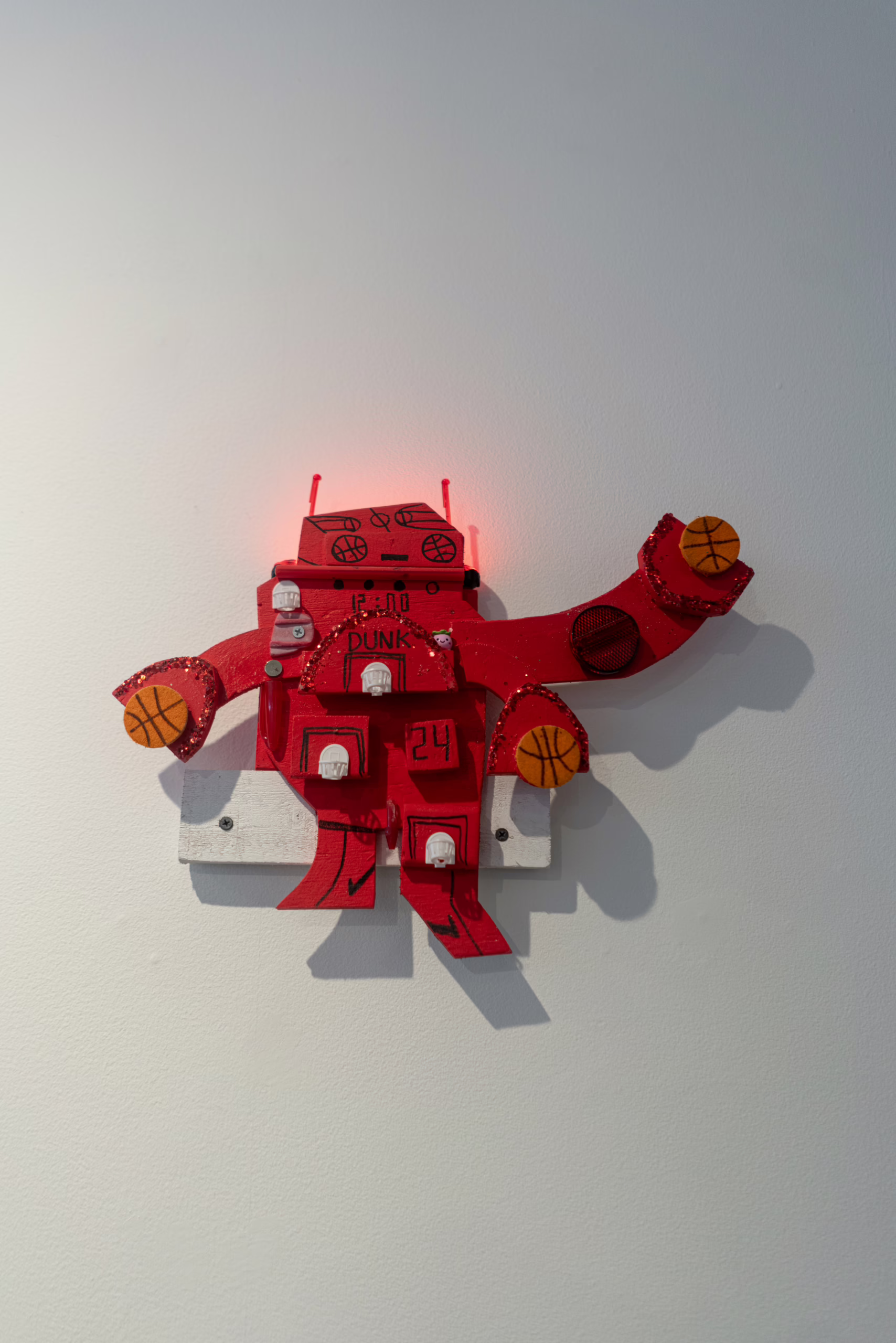 This quintet of BBallBots form a fearsome starting five honoring my love of hoops and robots. They are mixed media pieces made of found materials, wood, toys, plastic parts, electronic lights, and noisy toy parts. They form an imposing starting five honoring the game of basketball invented in Massachusetts by Dr. James Naismith.