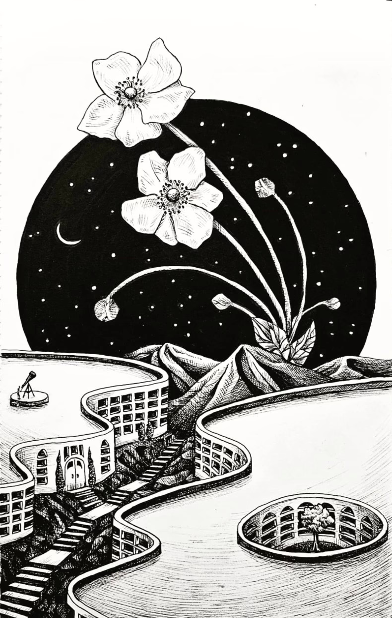 Via my creative process, I visualize both the collision and the osmosis of the inner and outer experience. Where does our subjective inner world end, and where does our objective outer world begin? With illustration that integrates the natural and organic, the architectural and mathematical, and the psychological and mythical, I strive to express this surreal interchange of perception, memory, and fantasy.